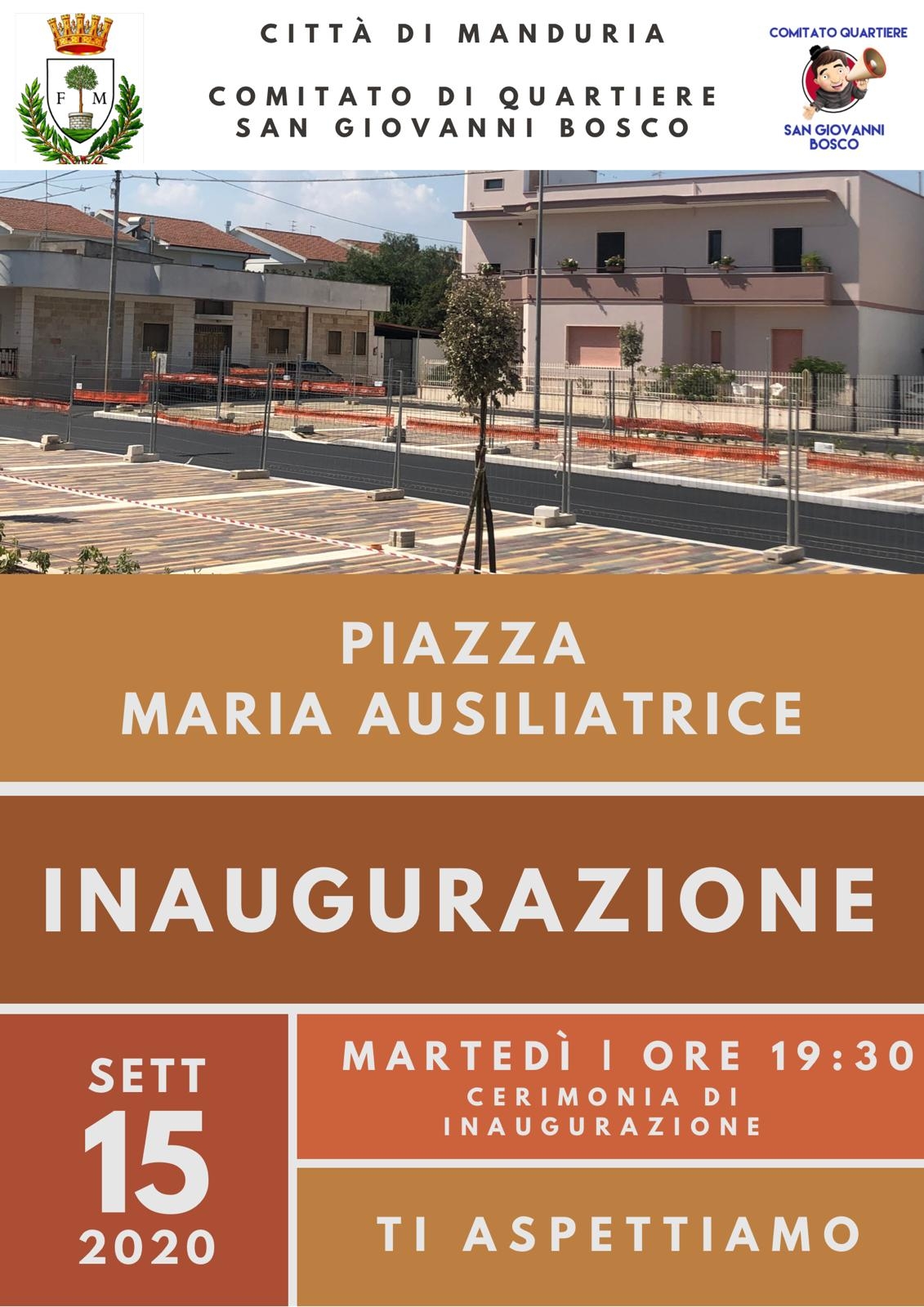 Martedì 15 settembre, alle ore 19.30, ci sarà l’inaugurazione di piazza Maria Ausiliatrice a conclusione dei lavori di rifacimento della stessa. Questo momento, semplice e conviviale, è nato da un’intesa positiva tra il direttivo del comitato di quartiere “San Giovanni Bosco” di Manduria e il Comune nella persona dei tre Commissari straordinari.