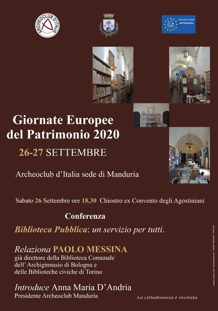«La sede di Manduria, impegnata già da tempo nella tutela della Biblioteca comunale “Marco Gatti”, nella convinzione dell’importanza del servizio di una biblioteca pubblica per l’intera comunità, ha organizzato per sabato 26 settembre, alle ore 18:30, presso il chiostro dell’ex convento degli Agostiniani, una conferenza sul tema “Biblioteca pubblica: un servizio per tutti”» è riportato in una nota a firma della presidente di Manduria di Archeoclub, Anna Maria D’Andria.
