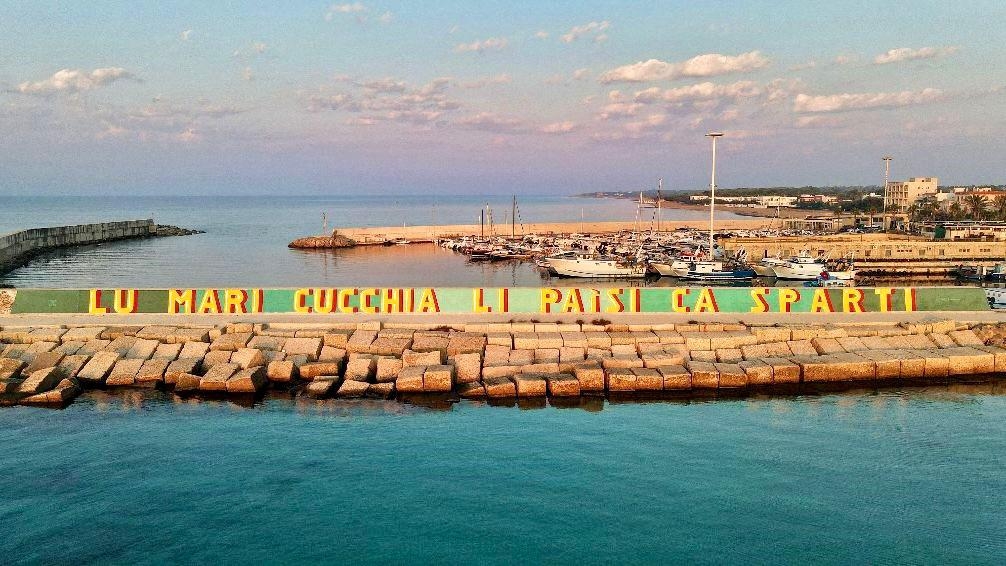 Il molo si colora di una nuova opera artistica: è stata realizzata dall’artista Filippo Giovanelli ed è un messaggio, in dialetto maruggese, sul ruolo del mare: unisce i paesi che divide. Quasi un gioco di parole, che tradotto in maruggese suona così: “Lu mari cucchia li paìsi ca sparti”.
