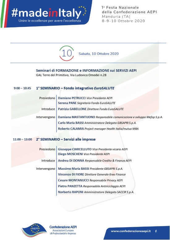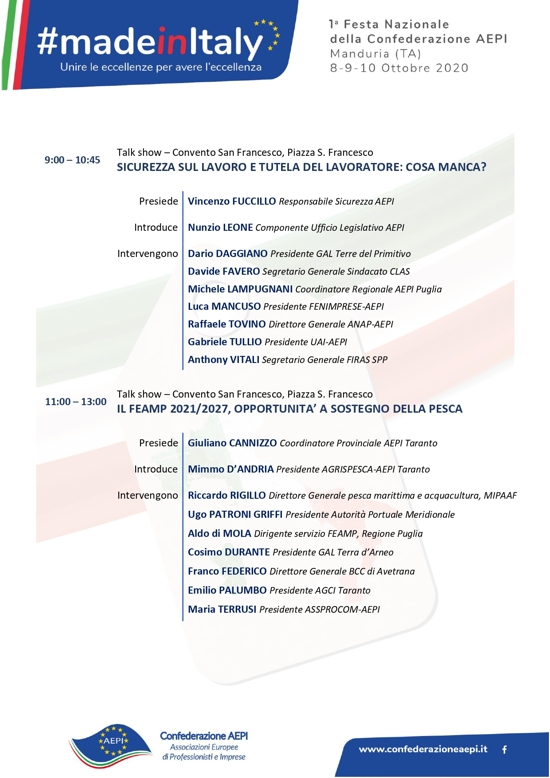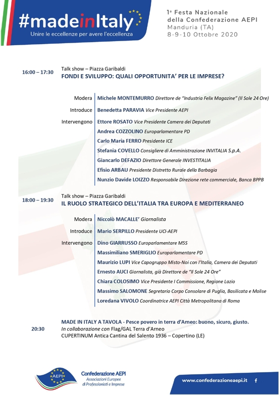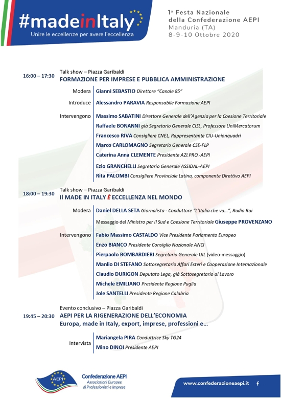 Filo conduttore il made in Italy inteso come eccellenza da tutelare, valorizzare e promuovere. Talk show, seminari ed eventi con circa quindici appuntamenti suddivisi nella tre giorni. Si alterneranno rappresentanti di governo, istituzioni a vari livelli, sindacati, enti pubblici e associazioni di categoria.
