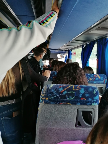Pullman stracolmi con studenti in piedi, inevitabilmente uno vicino all'altro.
