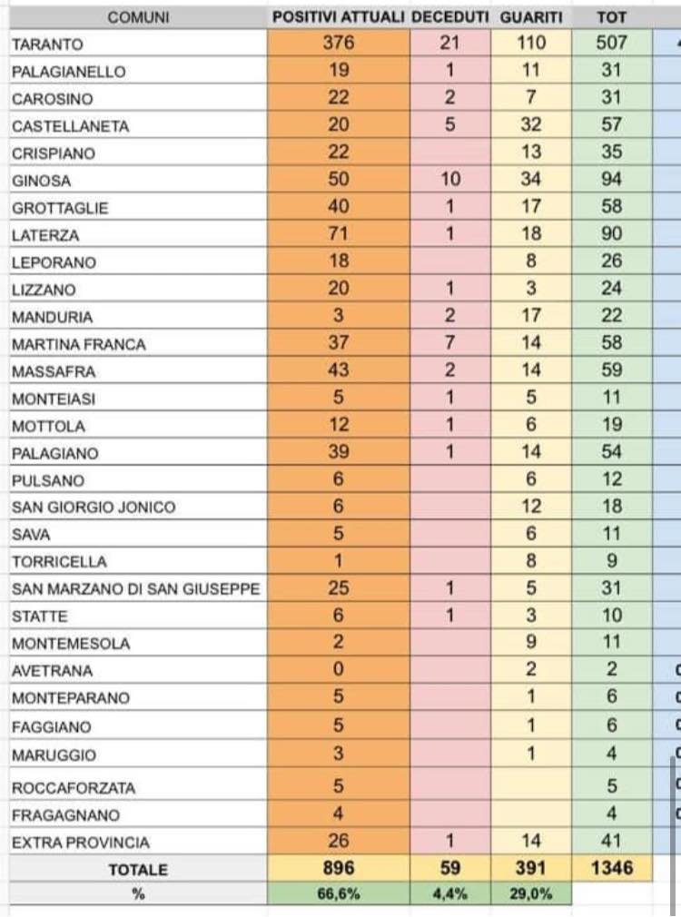 Ben 71 casi a Laterza. La città capoluogo è a quota 376. L’unico comune covid free della provincia è Avetrana