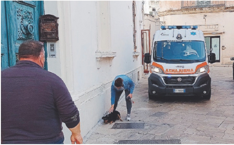 Il piccolo Moro, un pincher molto sveglio, avvisa con i latrati che la sua padrona non sta bene. Poi, quando arrivano i vigili del fuoco e l’ambulanza, lui gira come una trottola intorno ai mezzi di soccorso, comprendendo perfettamente la situazione.