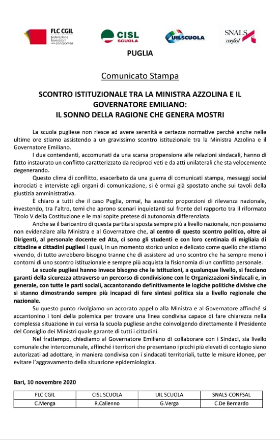 La scuola pugliese non riesce ad avere serenità e certezze normative perché anche nelle ultime ore stiamo assistendo a un gravissimo scontro istituzionale tra la Ministra Azzolina e il Governatore Emiliano. I due contendenti, accomunati da una scarsa propensione alle relazioni sindacali, hanno di fatto instaurato un conflitto caratterizzato da reciproci veti e da atti unilaterali che sta velocemente degenerando.