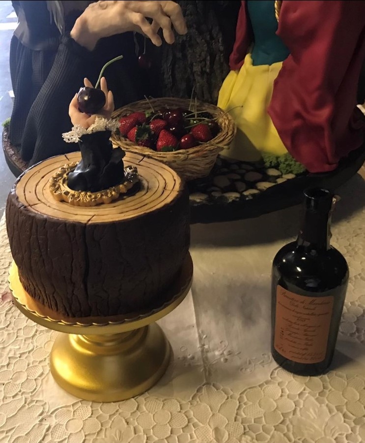 «La torta simboleggia la continua lotta del bene contro il male» raccontano i coniugi Claudia ed Ettore. «Il male, rappresentato dalla strega, offre a Biancaneve delle ciliegie, le quali sono una continua tentazione. Ma Biancaneve, sospettosa, non accetta. Il tronco dell’albero, posizionato al centro della torta, è stato realizzato da un calco della corteccia degli alberi d’ulivi e riprodotta in pasta di zucchero. Proprio da quegli ulivi che stanno morendo nel Salento perchè attaccati dalla Xylella fastidiosa, un dramma da noi molto sentito proprio perché salentini.