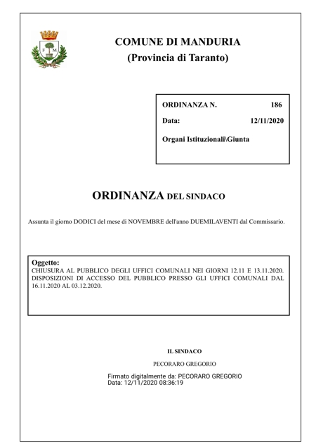 L’ordinanza del sindaco Pecoraro che dispone la chiusura degli uffici comunali per domani e dopo domani