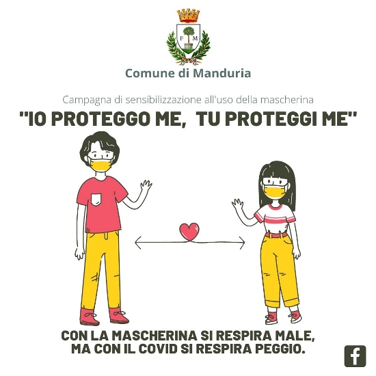 Sulla base di ciò, ho deciso di dare inizio a una campagna di sensibilizzazione e di informazione rivolta ai giovani e a tutta la comunità manduriana allo scopo di stimolare al massimo l'uso della mascherina affinché la medesima diventi parte integrante del guardaroba di tutti i giorni ed un elemento indispensabile, come il cellulare o le chiavi di casa.