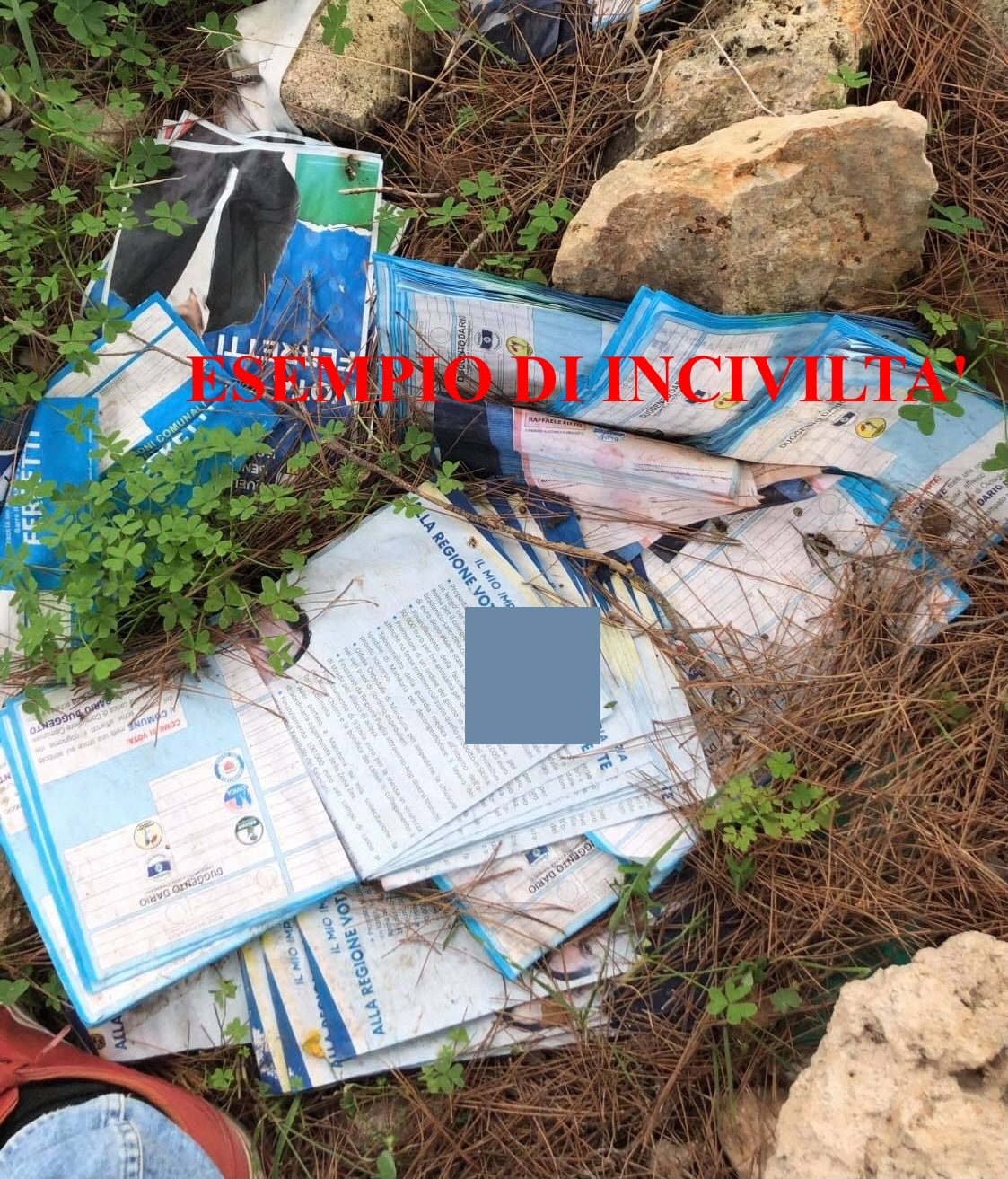 A due mesi dal primo turno delle recenti elezioni, ci sono ancora ampie tracce della competizione elettorale. Sono state lasciate da chi, evidentemente, ha pensato di sbarazzarsi di centinaia di fac simili gettandoli dal finestrino dell’auto mentre percorreva la Manduria-San Pietro in Bevagna.