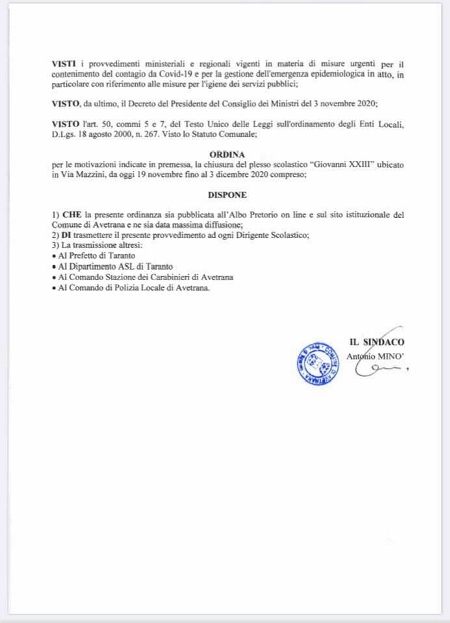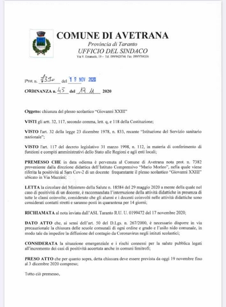 Il sindaco di Avetrana Antonio Minò ha stabilito, attraverso un’ordinanza, la chiusura del plesso “Giovanni XXIII” sino al 3 dicembre. La decisione è stata assunta in seguito alla segnalazione di un nuovo caso di positività che ha interessato un docente di questa scuola.