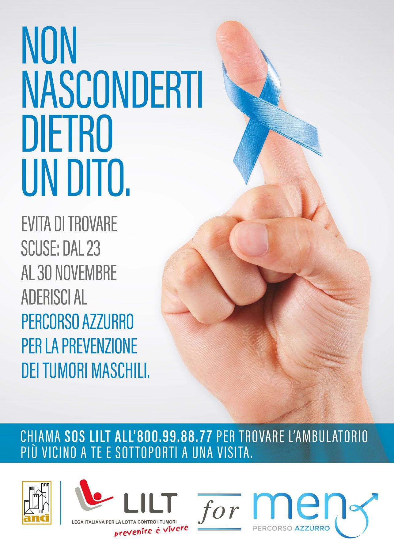 «Non nasconderti dietro un dito» è l’invito rivolto dalla Lega Italiana per la Lotta contro i Tumori a tutti gli uomini restii a sottoporsi a controlli urologici. L’appello alla prevenzione dei tumori dell’apparato urinario e riproduttivo maschile viene rivolto in particolare in questi giorni in occasione della campagna Percorso Azzurro - Lilt For Men, a cui aderisce anche l’Associazione Provinciale di Taranto della Lilt.