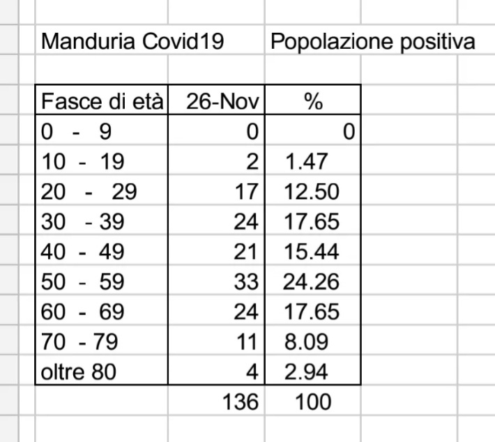 Quasi nulli i casi fra i più giovani: Sono due i manduriani (1,47%) positivi nella fascia di età fra 10 e 19 anni, mentre nessun bambino fra 0 e 9 anni risulta positivo.