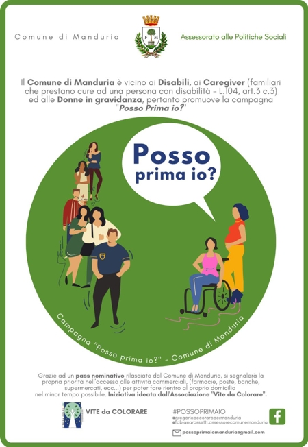 “Posso prima io?”: è la campagna di sensibilizzazione avviata dal Comune di Manduria al fine di consentire a disabili o ai familiari che prestano assistenza, a donne in gravidanza, a personale sanitario (Medici, infermieri, OSS) di avere precedenza nell’accesso alle attività commerciali, agli uffici postali, bancari, etc, così da ridurre il tempo per il rientro al proprio domicilio.