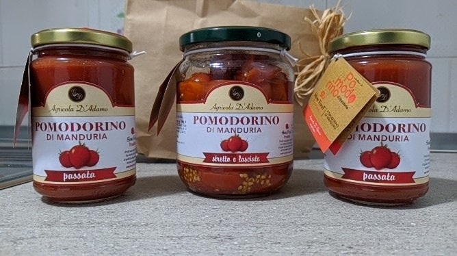 Rispettando il disciplinare di produzione, l’azienda agricola D’Adamo (una piccola ma brillante realtà a conduzione familiare) ha raccolto, lavorato e trasformato i pomodorini di Manduria.