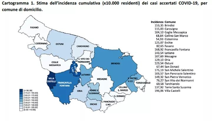 Per quanto riguarda la distribuzione per Comune i positivi sono 342 a Brindisi, 252 a Francavilla Fontana, 112 a Mesagne, 98 a Oria, 82 a Ceglie Messapica, 77 a Latiano, 67 a Fasano, 67 a Torre Santa Susanna, 63 a Ostuni, 56 a Villa Castelli, 47 a San Pietro Vernotico, 44 a San Vito dei Normanni, 40 a Carovigno, 33 a Erchie, 22 a San Michele Salentino, 21 a San Pancrazio Salentino, 14 a Cisternino, 7 a Cellino San Marco, 5 a San Donaci, 4 a Torchiarolo. I Comuni della provincia di Brindisi con i maggiori valori di incidenza cumulativa sono, nell’ordine, Villa Castelli, San Michele Salentino e Francavilla Fontana.