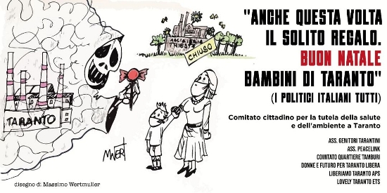 Da oggi, il manifesto di metri 6x3 a firma del Comitato cittadino per la salute e l’Ambiente a Taranto sarà visibile su Viale Magna Grecia angolo corso Italia. Anche questo Natale, i soliti veleni.