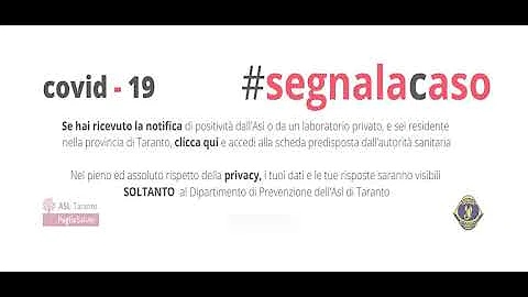 Al momento della notifica di positività al Coronavirus, i soggetti interessati e residenti nell’area jonica saranno invitati a compilare il form disponibile sul sito dell’Ordine degli Ingegneri della provincia di Taranto (https://www.ordingtaranto.it/asl-taranto-segnala-caso/). Entro 48 ore dalla notifica, i positivi al Coronavirus potranno così inviare al Dipartimento di Prevenzione della Asl tutte le informazioni necessarie.
