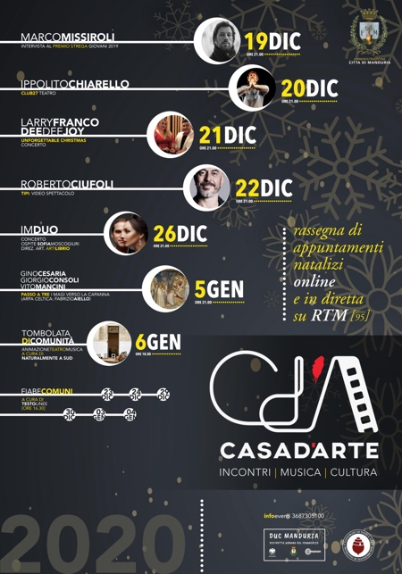 “Tombolata di comunità”: Animazione, Teatro e Musica a cura della cooperativa Rinascita (SPRAR di Manduria) e dell’associazione Naturalmente a Sud. Musiche dal mondo e letture con Giulio Bianco, Rachele Andrioli, Rocco Nigro, Redi Hasa, Simone Franco. Questo evento sarà fruibile unicamente sui canali social sopra indicati - 23-24-29-30 dicembre 2020 / 3-4 gennaio 2021, ore 16.30: