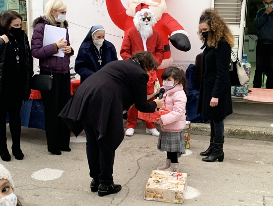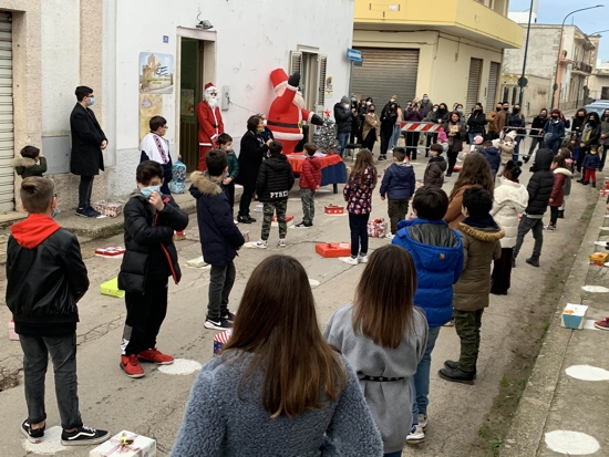 Tutti i bambini – distanziati tra loro con la scatola su un cerchio bianco dipinto a terra – a turno hanno consegnato la loro scatola ricevendo un sacchetto di caramelle da Babbo Natale e un attestato di partecipazione; le scatole sono state poi consegnate ai rappresentanti delle due Case di riposo presenti all’evento.