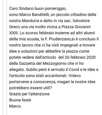 Ebbene, un alunno che frequenta la classe VA della scuola primaria “Prudenzano” e che ha partecipato alla realizzazione di quel lavoro, cogliendo l’invito del sindaco finalizzato ad inviargli delle lettere per il Natale 2020, ha scritto al dott. Gregorio Pecoraro, allegandogli la pagina de “La Gazzetta del Mezzogiorno” e sottoponendogli le idee e le proposte dei suoi coetanei.