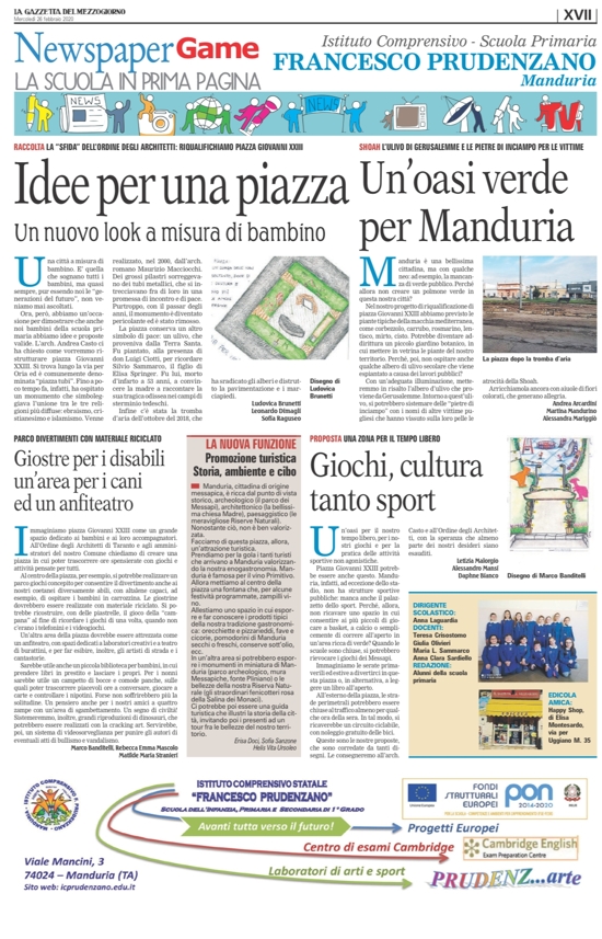 Dagli alunni della scuola primaria “Francesco Prudenzano” una serie di idee e proposte sulla valorizzazione di piazza Giovanni XXIII. Un lavoro che fu eseguito nei primi mesi del 2020 da un gruppo di alunni che, nello scorso anno scolastico, frequentavano le classi quarte della scuola primaria. Alunni che furono seguiti dalle maestre Sardiello, Olivieri, Sammarco e Crisostomo. I risultati di questo lavoro, alla cui base vi fu una proposta partita dall’Ordine degli Architetti di Taranto, furono pubblicati in un’intera pagina de “La Gazzetta del Mezzogiorno”. L’obiettivo era quello di raccogliere queste idee e di presentarle in un convegno della Fiera Pessima a marzo.
