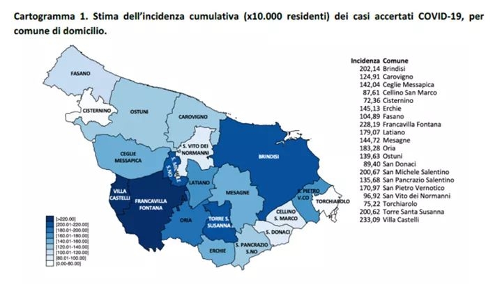 Per quanto riguarda la distribuzione per Comune i positivi sono 323 a Brindisi, 133 a Francavilla Fontana, 69 a Fasano, 65 a Oria, 54 a Ceglie Messapica, 51 a Mesagne, 47 a Torre Santa Susanna, 40 a Ostuni, 31 a Latiano, 27 a San Vito dei Normanni, 17 a San Pancrazio Salentino, 16 a Cisternino, 16 a Villa Castelli, 15 a Erchie, 14 a San Michele Salentino, 12 a San Pietro Vernotico, 12 a San Donaci, 11 a Carovigno, 9 a Cellino San Marco, 4 a Torchiarolo. I Comuni della provincia di Brindisi con i maggiori valori di incidenza cumulativa sono, nell’ordine, Villa Castelli, Francavilla Fontana, Brindisi, San Michele Salentino, Torre Santa Susanna.