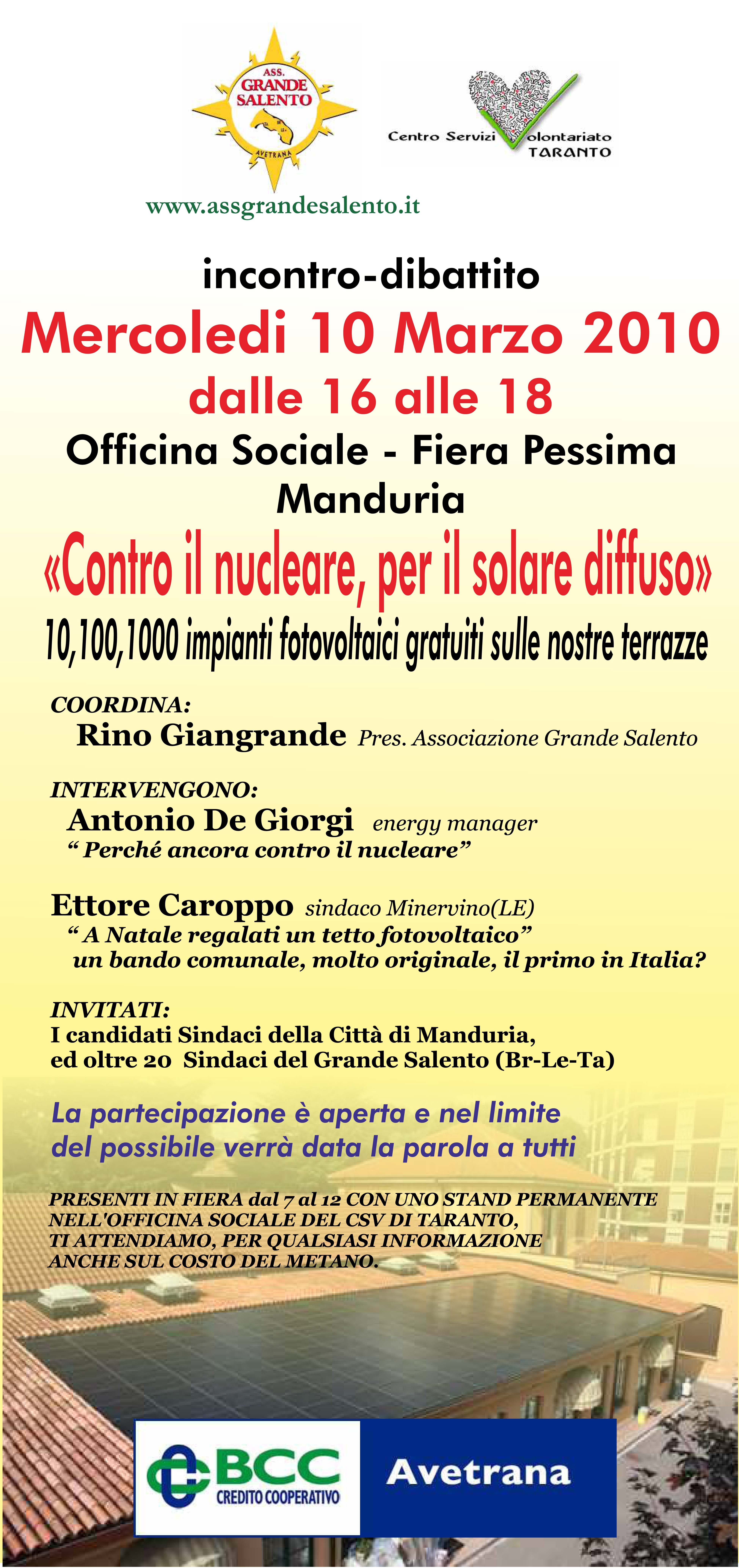 Interverranno Antonio De Giorgi, energy manager (“Perché ancora contro il nucleare” il tema della sua relazione), e il sindaco di Minervino, Ettore Caroppo (“A Natale regalati un tetto fotovoltaico: un bando comunale, molto originale, il primo in Italia”).