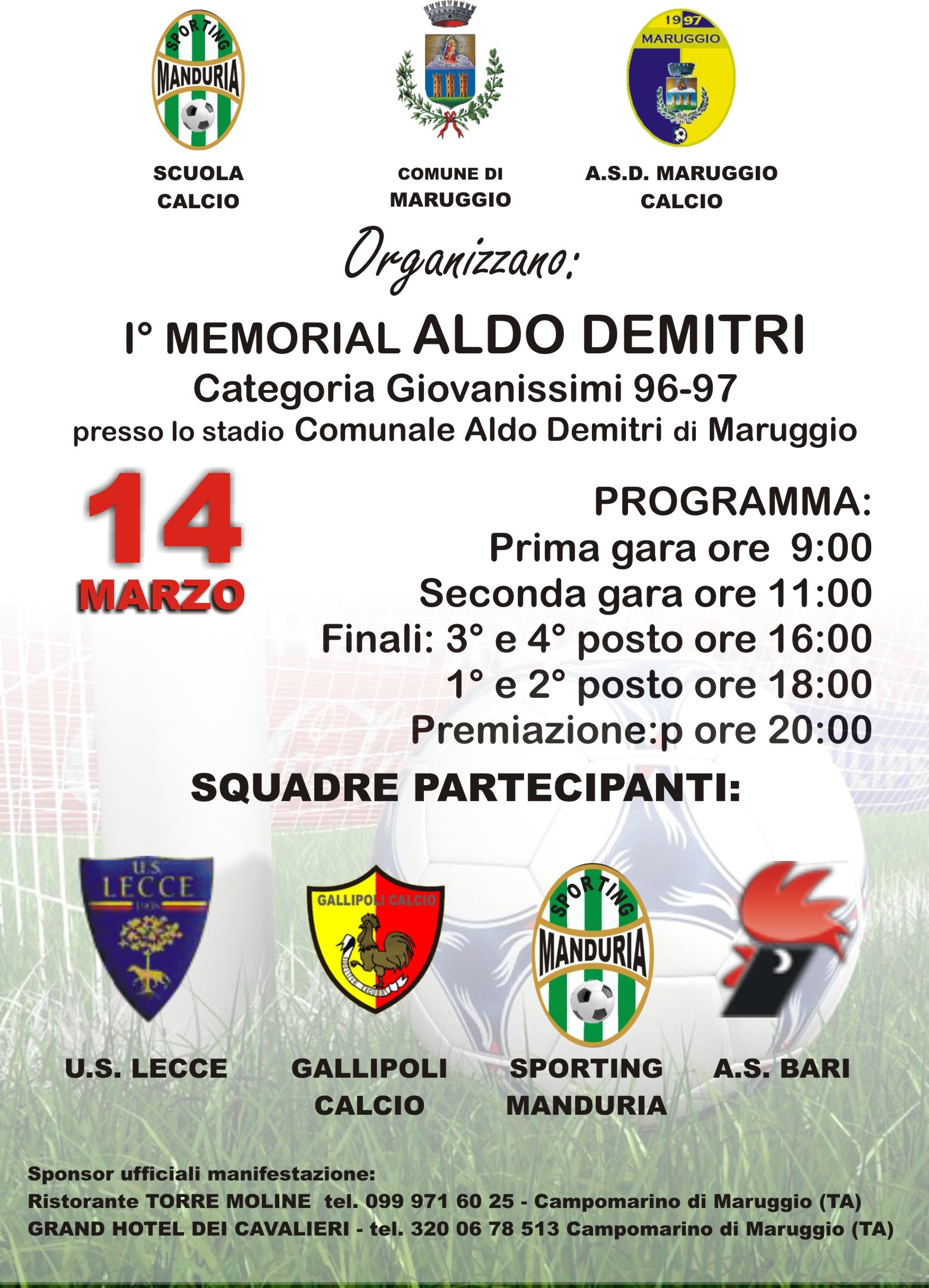 Memorial Aldo Demitri. Su iniziativa dello Sporting Manduria, del Maruggio e comune di Maruggio, è stato organizzato una quadrangolare, riservato alle squadre Giovanissimi. Hanno aderito, oltre allo Sporting Manduria, il Bari, il Lecce e il Gallipoli.Il programma prevede, per le ore 9 e per le ore 11 le due semifinali. Nel pomeriggio, alle 16 la finale per il terzo e quarto posto, e alle 18 la finale per il primo e secondo posto. Alle 20 la premiazione.