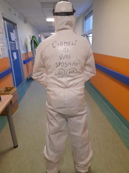 E’ sicuramente fra le più originali proposte di matrimonio: l’ha scritta sulla tuta di protezione dal Covid.