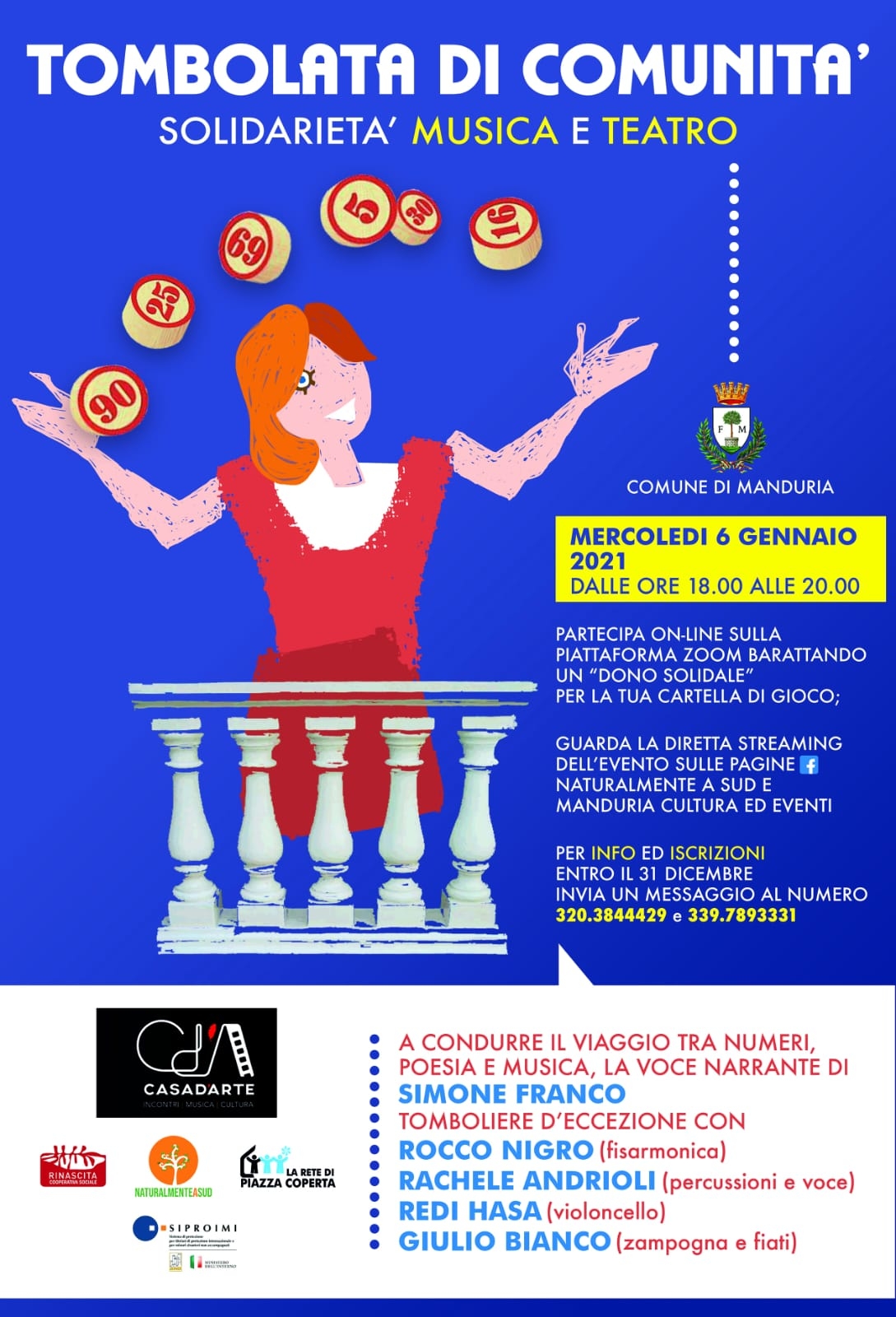 Le fasi di gioco saranno scandite dalla voce narrante dell’attore Simone Franco, tomboliere d’eccezione, che condurrà la serata in compagnia dei musicisti Rocco Nigro (fisarmonica), Rachele Andrioli (percussioni e voce), Redi Hasa (violoncello) e Giulio Bianco (zampogna e flauti) in un vero e proprio viaggio musicale.