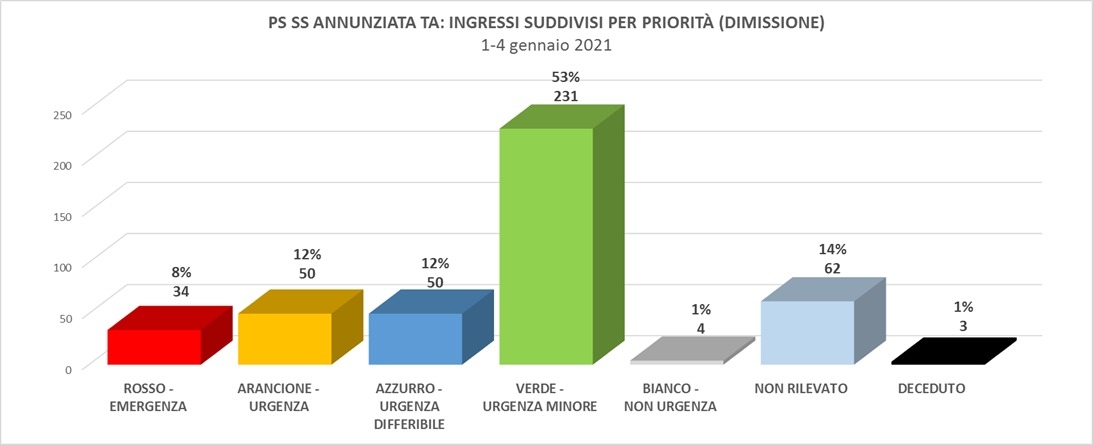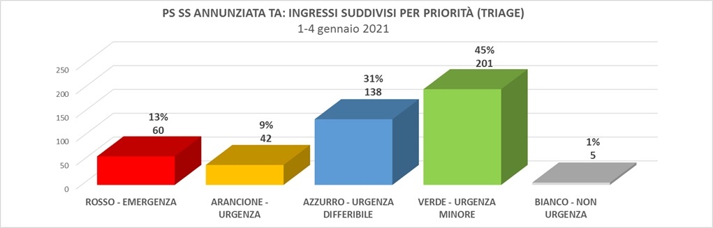 «Nel periodo dal 1° al 4 gennaio 2021 il Pronto Soccorso dello stabilimento “SS. Annunziata” di Taranto ha fatto registrare nel complesso n. 446 accessi. Tra questi, il triage ha classificato con codice di urgenza rosso 60 casi, pari a poco più del 13%. Circa la metà dei casi sono stati classificati con codice bianco o verde, che denotano non urgenza o urgenza minore.