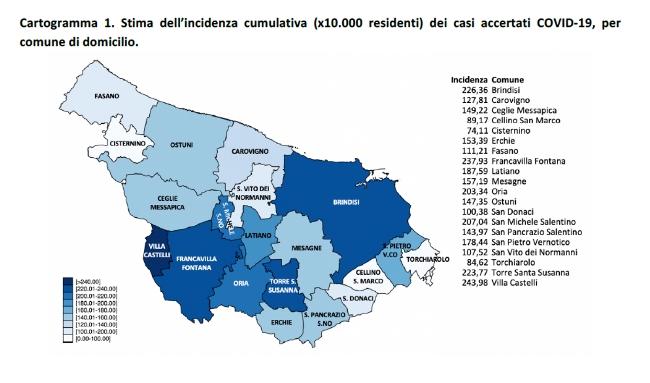 Per quanto riguarda la distribuzione per Comune i positivi sono 368 a Brindisi, 76 a Fasano, 75 a Francavilla Fontana, 74 a Oria, 60 a Mesagne, 55 a Torre Santa Susanna, 50 a Ostuni, 42 a Ceglie Messapica, 35 a San Vito dei Normanni, 29 a Latiano, 17 a San Pancrazio Salentino, 15 a Erchie, 14 a Villa Castelli, 13 a San Michele Salentino, 13 a San Pietro Vernotico, 12 a San Donaci, 8 a Carovigno, 8 a Cisternino, 8 a Torchiarolo, 3 a Cellino San Marco. I Comuni della provincia di Brindisi con i maggiori valori di incidenza cumulativa sono, nell’ordine, Villa Castelli, Francavilla Fontana, Brindisi, Torre Santa Susanna, San Michele Salentino, Oria.