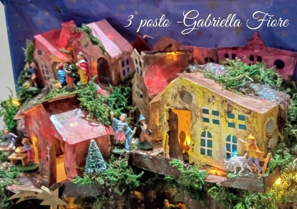 3° posto – Gabriella Fiore: il Presepe si mostra subito per i suoi colori e per la creatività dei materiali. È realizzato all’interno di una scatola. Risulta molto fantasioso, con molti elementi di decoro, di immedesimazione, di ambientazione che sono il frutto del gusto e della creatività di chi lo ha realizzato.