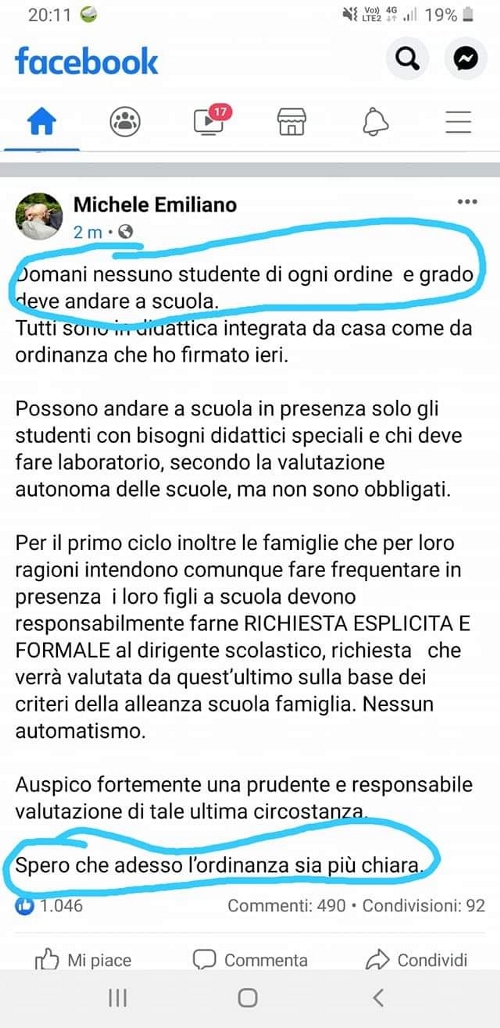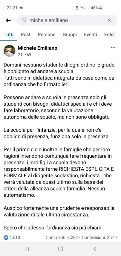 “Nessuno studente di ogni ordine e grado deve andare a scuola”, scrive inizialmente Emiliano, contraddicendo ciò che invece è contenuto nella sua ordinanza. Dopo essersi reso conto del pasticcio che aveva creato, Emiliano ha corretto il suo post, scrivendo che “nessuno studente è obbligato ad andare a scuola”.