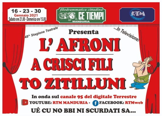 Le commedie, verranno trasmesse anche attraverso il canale Youtube all’indirizzo “RTM Manduria” e sulla pagine Facebook “RTM web”.