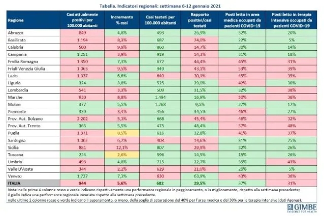 Per quanto riguarda invece il monitoraggio settimanale indipendente effettuato dal Fondazione Gimbe, analizzando la settimana 6-12 gennaio 2021, si registra l’incremento dei nuovi casi rispetto alla settimana precedente (121.644 vs 114.132), a fronte di un lieve calo del rapporto positivi/casi testati (29,5% vs 30,4%).