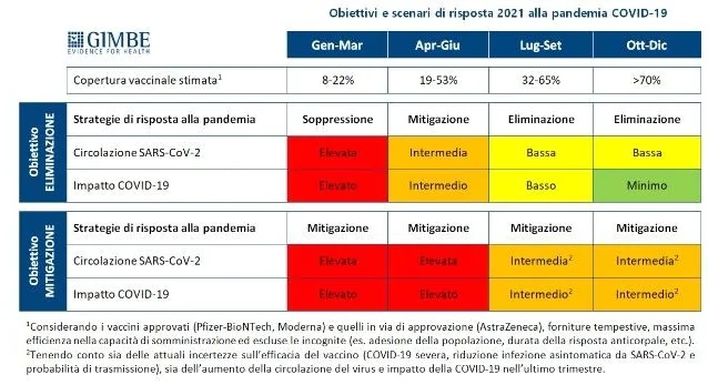 Se tra luglio e settembre ci sarà una copertura vaccinale tra il 32-65% Gimbe prevede una strategia di ‘eliminazione', ovvero un'azione di contrasto che interrompa la catena di trasmissione del virus, con azioni tempestive e incisive in caso di individuazione di nuovi focolai, attraverso un efficiente sistema di testing & tracing e l’isolamento non più fiduciario ma controllato, oltre alle misure individuali, sulla scia di quanto accaduto in Cina e Hong Kong, ma anche in Corea del Sud, Taiwan, Australia, Nuova Zelanda. In questo modo di otterrà secondo l'analisi una circolazione bassa, e un altrettanto basso impatto dell'infezione.