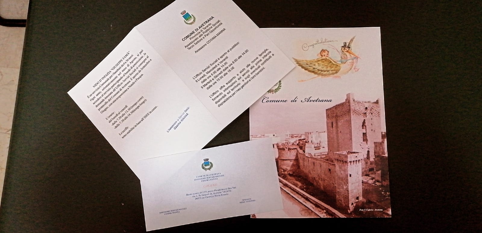 «Per omaggiare i bambini nati da gennaio a dicembre del 2020 e dare loro il benvenuto, l’assessore ai Servizi Sociali Mimma Manna, insieme al sindaco Antonio Minò, consegneranno un attestato di benvenuto e di congratulazioni ai neo genitori e un opuscolo informativo sui servizi di prima infanzia: cos’è, come si richiede e come funziona il congedo di maternità, a chi spetta e come fare ad ottenere l’assegno di maternità, quando e come effettuare la dichiarazione di nascita, a chi rivolgersi per la scelta pediatria, come ricevere informazioni sulle vaccinazioni, come ottenere il documento d’identità e informazioni sull’asilo nido riservato ai bambini da 0 a 36 mesi» è riportato in una nota del Comune di Avetrana. «Durante l’incontro sarà consegnato un cadeaux offerto dalla parafarmacia della dott.ssa Maria Rosaria Carrozzo (“Dea Nat”), ovvero un buono sconto del 15% su tutti i prodotti per i neonati.