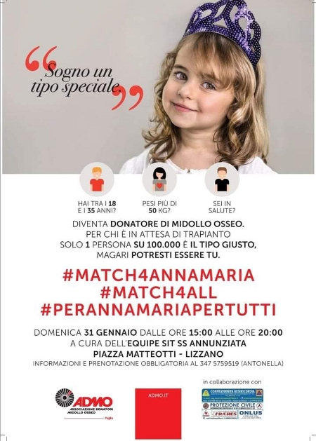 A Lizzano è in corso una “contaminazione d’amore” per Annamaria, che malata da più di un anno di leucemia attende un trapianto di midollo osseo. Il compatibile non c'è, ma se hai un'età compresa tra i 18 e i 35 anni, magari potresti essere proprio tu il suo tipo giusto, proprio tu a donarle una nuova speranza! 1 su 100 mila la possibilità di trovare il compatibile da Registro, basta un piccolo prelievo di sangue e diventerai un potenziale donatore #PerAnnamariaPerTutti.