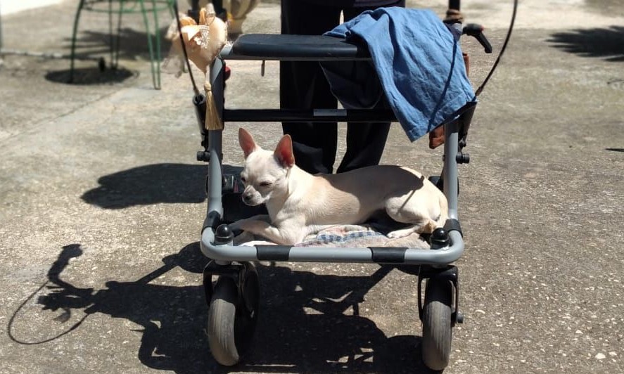 Indossa una pettorina nera e arancione: chi lo dovesse avvistare, avvisi la famiglia che l’ha adottato