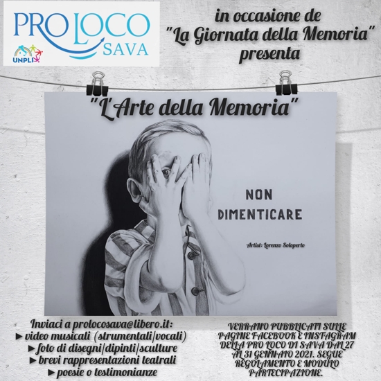 Dal 27 gennaio al 31 gennaio, sulle pagine Facebook, Instagram della Pro Loco di Sava verranno pubblicati i video di esecuzioni musicali, canori, teatrali, di testi di poesie, di dipinti, di foto, dal tema “L'Arte della Memoria”.