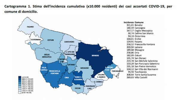 I Comuni della provincia di Brindisi con i maggiori valori di incidenza cumulativa sono, nell’ordine, Brindisi, Torre Santa Susanna, Villa Castelli, Oria e Francavilla Fontana.