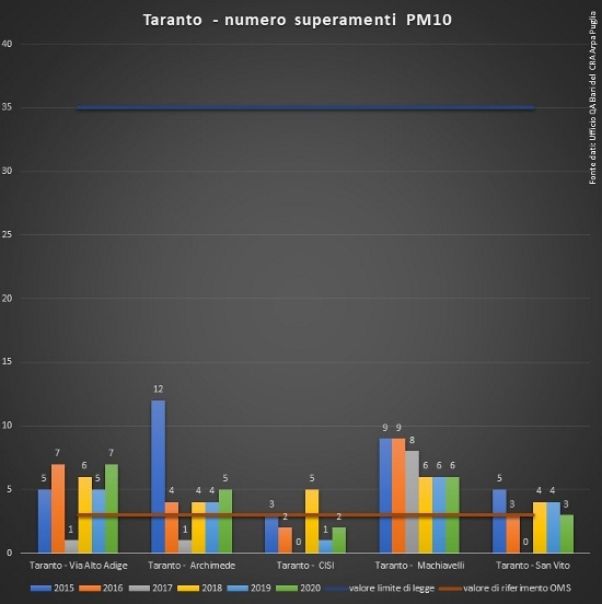 Su tre centraline (“Taranto-via Alto Adige”, Taranto-Archimede” e “Taranto-CISI”) si osserva che i superamenti sono aumentati dal 2019 al 2020. Nella centralina di “Taranto-Machiavelli” i superamenti del 2020 uguagliano quelli del 2019 e nella stazione di “Taranto-San Vito” nel 2020 si è registrato un superamento in meno rispetto al 2020.