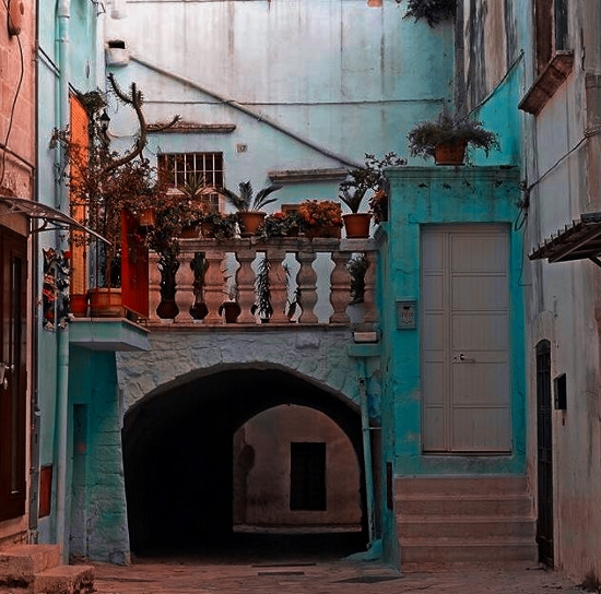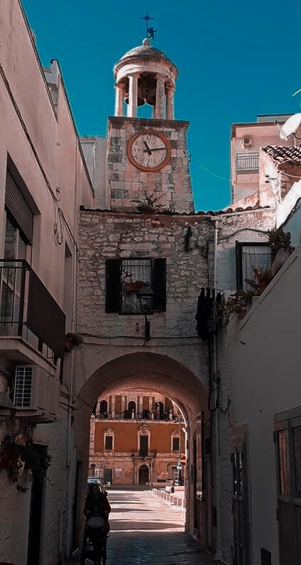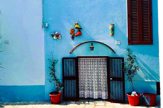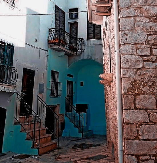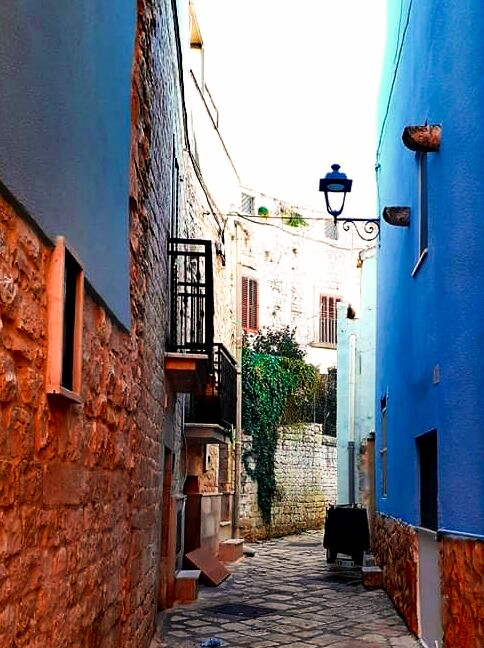 Il cielo della Puglia è già celeste e se ad esso associamo dei vicoli stretti e medioevali ma colorati di un blu ormai sbiadito, tanto da essere diventato celeste pastello, allora la sensazione è proprio quella di essere coperti dolcemente dal manto della Madonna