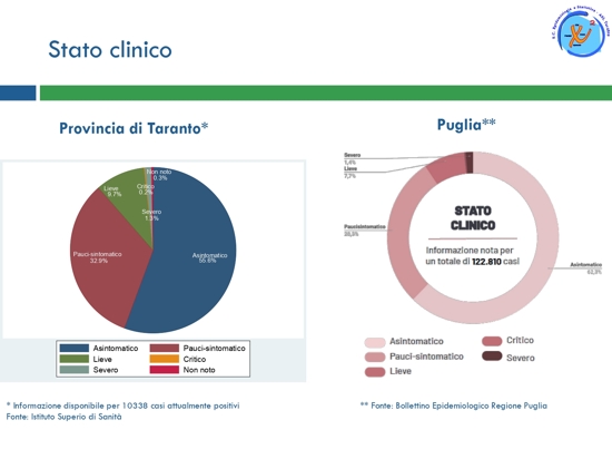 STATO CLINICO – In provincia di Taranto, il 55,6% dei casi è stato classificato come asintomatico; il 32,9% come paucisintomatico; il 9,7% come lieve, l’1,3% come severo.