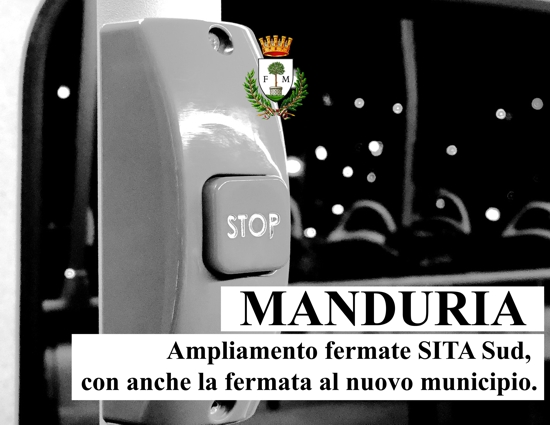 L’Amministrazione comunale di Manduria comunica alla cittadinanza che il servizio urbano “Sita Sud” (percorsi bus Manduria, Uggiano e Zona Barci) ha incrementato il consueto percorso stradale aggiungendo la fermata per il Palazzo di Città in Via Frà Margarito 1.