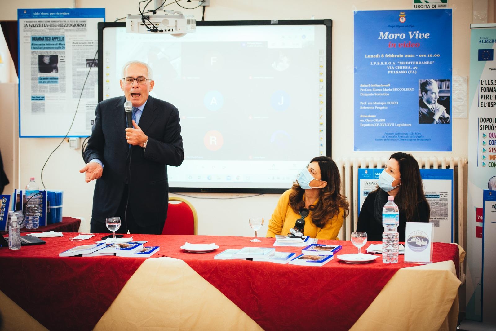 Si è aperta con una grande pagina di Storia la settimana degli allievi dell’Istituto Alberghiero Mediterraneo di Pulsano e Maruggio che, grazie al progetto “Moro Vive” - promosso dal Consiglio Regionale della Puglia - hanno incontrato l’onorevole Gero Grassi, già Deputato della XV, XVI e XVII legislatura nonché Deputato proponente la legge istitutiva della II Commissione d’inchiesta sul rapimento e l’uccisione di Aldo Moro.