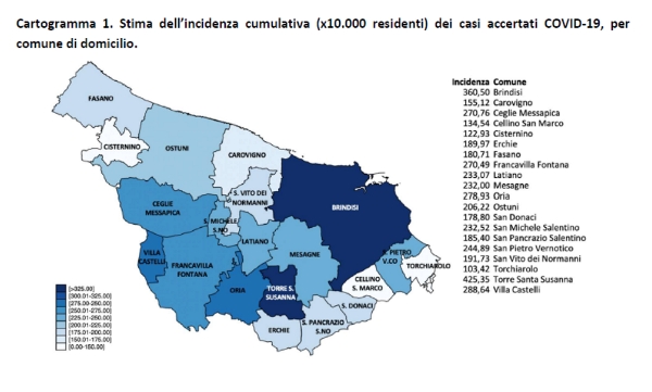 Per quanto riguarda la distribuzione per Comune i positivi sono 316 a Brindisi, 180 a Fasano, 97 a Ceglie Messapica, 78 a Torre Santa Susanna, 71 a Mesagne, 56 a Ostuni, 50 a San Vito dei Normanni, 40 a Latiano, 30 a Francavilla Fontana, 28 a San Pancrazio Salentino, 26 a San Donaci, 21 a Oria, 19 a Cellino San Marco, 16 a Erchie, 16 a Villa Castelli, 14 a Cisternino, 10 a Carovigno, 7 a San Pietro Vernotico, 4 a San Michele Salentino, 4 a Torchiarolo. I Comuni della provincia di Brindisi con i maggiori valori di incidenza cumulativa sono, nell’ordine, Torre Santa Susanna, Brindisi, Villa Castelli, Oria, Ceglie Messapica e Francavilla Fontana.