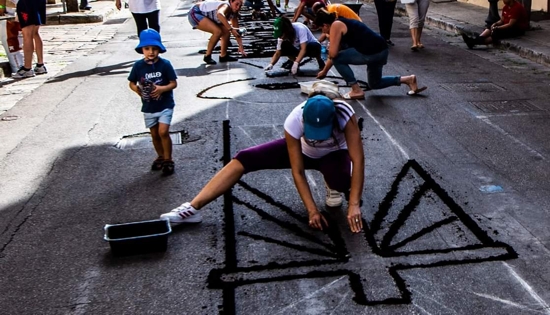 Si procede poi con l’elaborazione dei disegni su carta e a seguire per terra.