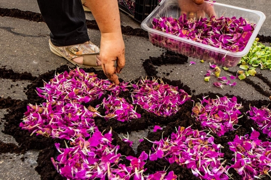 I preparativi iniziano qualche mese prima: si cerca di raccogliere quanti più fiori di svariati colori, si conservano al fresco all’interno di cassette in base alla cromia. Oltre ai fiori si raccolgono materiali di scarto come i fondi di caffè, farine e cereali scaduti.