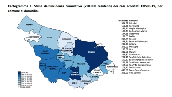 Per quanto riguarda la distribuzione per Comune i positivi sono 294 a Brindisi, 278 a Fasano, 73 a Mesagne, 65 a Ceglie Messapica, 56 a Torre Santa Susanna, 49 a Ostuni, 38 a Latiano, 36 a San Vito dei Normanni, 35 a Francavilla Fontana, 34 a San Donaci, 21 a Cisternino, 18 a Oria, 17 a San Pancrazio Salentino, 15 a Villa Castelli, 13 a Erchie, 8 a Carovigno, 8 a Cellino San Marco, 8 a San Pietro Vernotico, 5 a San Michele Salentino, 0 a Torchiarolo. I Comuni della provincia di Brindisi con i maggiori valori di incidenza cumulativa sono, nell’ordine, Torre Santa Susanna, Brindisi, Villa Castelli, Oria, Ceglie Messapica e Francavilla Fontana.